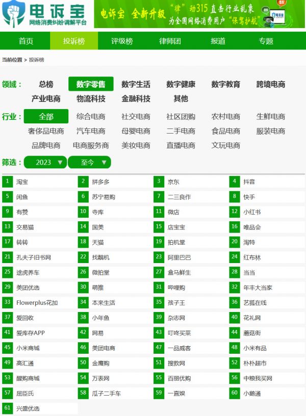 据国内知名网络消费纠纷调解平台“电诉宝”(315.100EC.CN)显示,2023年至今数字零售领域的投诉事件按投诉量排序依次为淘宝、拼多多、京东、抖音、闲鱼、苏宁易购、二三良作、快手、有赞、寺库、微店、小红书、交易猫、国美、店宝宝、唯品会、转转、天猫、拍机堂、淘特、孔夫子旧书网、找靓机、阿里巴巴、红布林、途虎养车、微拍堂、盒马鲜生、当当、美团优选、萌推、哔哩购、年丰大当家、Flowersplus花加、本来生活、孩子王、艺狐在线、爱回收、小年鱼、杂志网、花礼网、爱库存、网易、叮咚买菜、蘑菇街、小米商城、美团电商、一品威客、小米有品、高汇通、金鹰购、搜款网、朴朴超市、醒购商城、万表网、百丽优购、中粮我买网、屈臣氏、瓜子二手车、一直娱、小鹅通、兴盛优选。