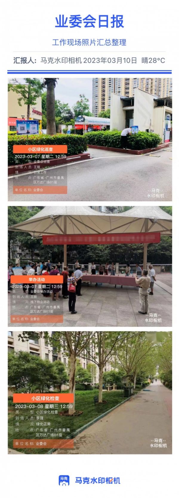 某小区业委会发现小区保洁对于一些角落地方总是不打扫或者打扫不干净。每当提起保洁却总是说有打扫,并且有照片为证,但业委会人员却无法核实照片的真实性。要求物业用马克水印相机拍照后,这种问题不再出现,提升管理效率避免扯皮。马克水印相机拍照,照片自带时间地点等水印信息,不可修改,确保真实性。