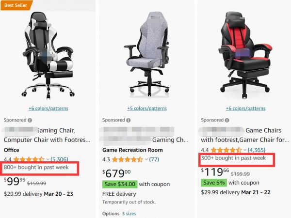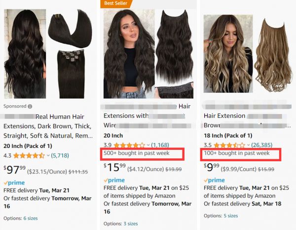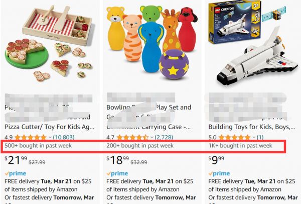 现在,亚马逊主动在PC端和移动端前台显示了产品销量,涉及玩具、服装、家居、母婴用品、假发等多个类目,如显示产品在“过去一周被购买800+”或“过去一个月卖出3k+”等。