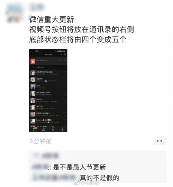 微信视频号再加码?有消息称,视频号将开放一级流量入口,在底部状态栏单独占用一个tab,和通讯录并列。大家怎么看?[思考]