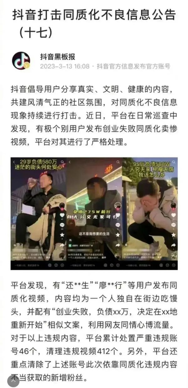 近日,平台在日常巡查中发现,有极个别用户发布创业失败同质化卖惨视频,已对此类账号进行了严格处理。