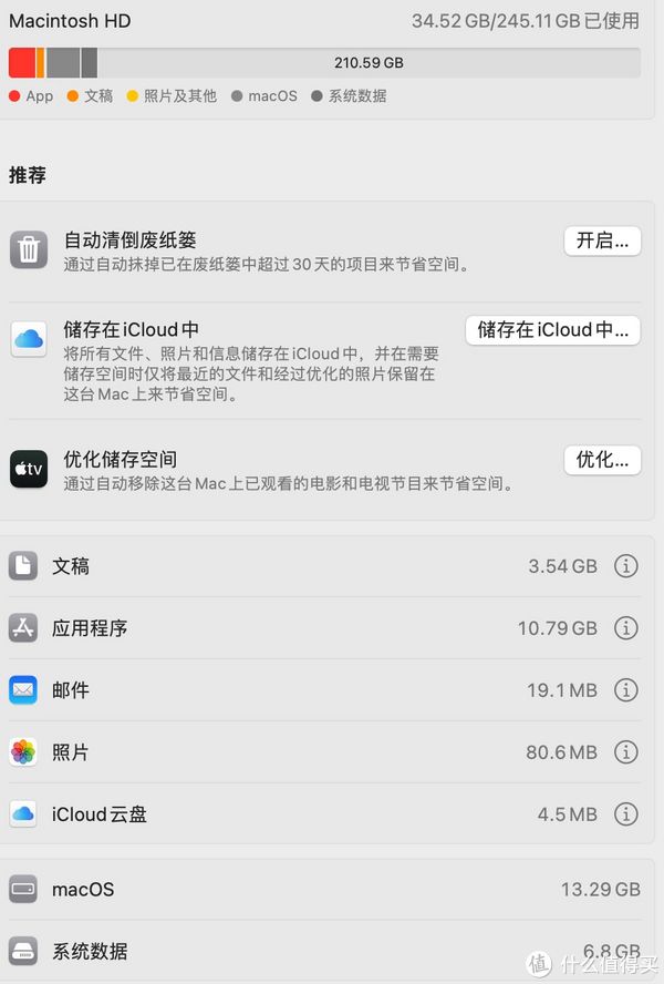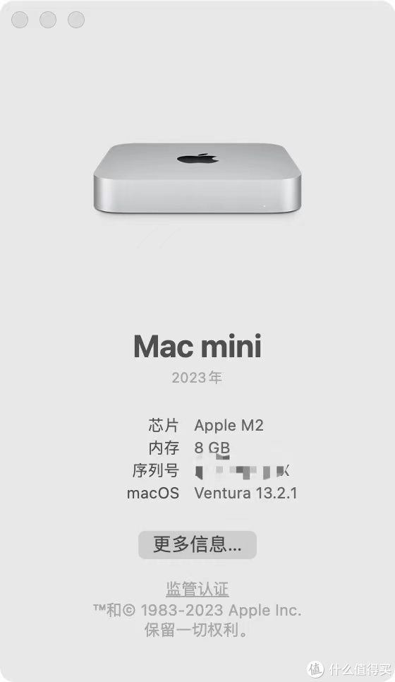 M2版本的Mac mini相比M1版本的总体性能提升大概在15%左右,两个雷电接口,两个A口,一个网络接口,外观接口和上一代几乎一摸一样,价格相比上一代缺便宜了整整800元。新机预装的是13.0系统,开机后升级到了13.2.1,这台256GB版本装完一些常用软件后,存储空间剩余210GB左右。
