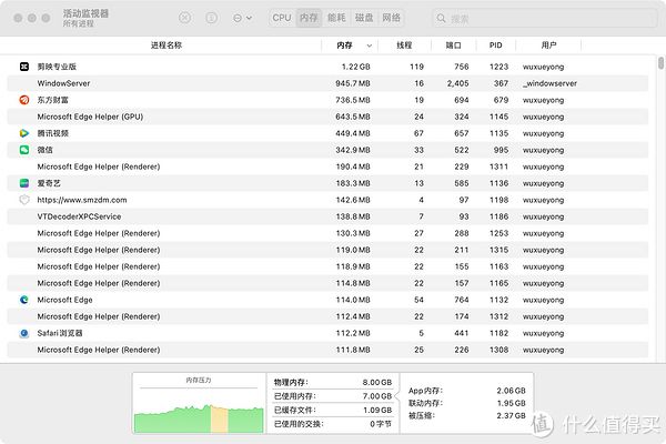 丐版的Mac mini内存只有8GB,如果需要更大的16GB内存则需要加1350元,相当于丐版价格的三分之一了,综合网友们使用感受,平时上上网,看看视频什么感觉8GB完全够用了,所以自己选购的是8GB的版本。实际到手后感觉内存是不够用的,打开诸如微信,腾讯视频,东方财富,QQ一类的常用软件后内存就占用5GB了,多打开几个网页,还有一些办公软件8GB的内存就见顶了。当然这时候感觉操作还算流畅的,可当我从休眠中唤醒电脑后,鼠标操作明显的卡顿,查看资源管理器内存出现黄色预警了。建议那些想入手这款Mac mini的同学最好上咬咬牙上16GB版本的,8GB内存就算日常应用也捉襟见肘。当然如果你只是想体验一下Mac OS然后就出掉的话,8GB也是不错的选择。