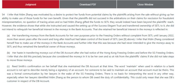 据此,新加坡高等法院认为,虽然有关资金在家族信托名下,但张兰为该等资金的实际权利人,张兰设立该家族信托的目的在于规避债权人对其名下财产的执行或索赔。