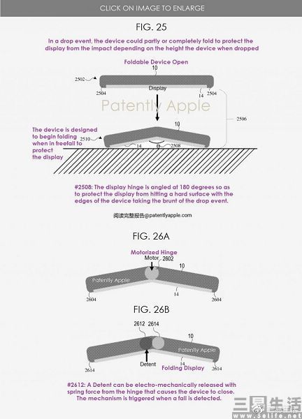 在苹果的这份专利文件中描述了这样一个技术,即通过在设备中使用的传感器来检测竖向加速度,以确定设备是否已经掉落。如果加速度超过设定的阈值时,则意味着设备已经掉落,其柔性屏之间铰链连接的释放机制就将被激活,让设备可以实现自动折叠。