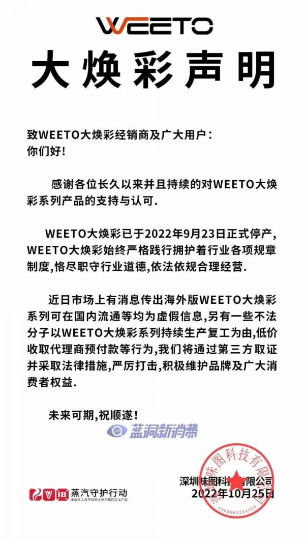 不过另外一家叫味图科技的公司也发布过大焕彩停产声明。