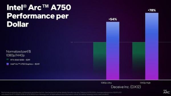 以锐炫A750为例,对比RTX 3060,其运行《Deceive Inc.》的每美元性能相对后者高出54%。在1080P Ultra画质和1440P高画质下均大幅领先。