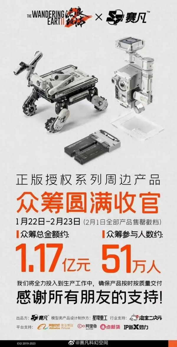 据《流浪地球2》官方正版授权商的赛凡科幻空间此前公布的数据显示,该系列产品在一个月的时间众筹总金额达1.17亿元,参与人数51万人。
