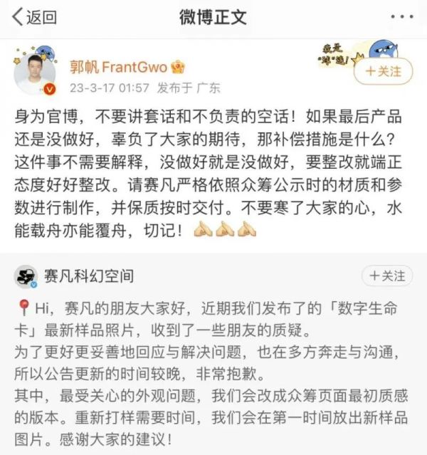 事情发酵到17日深夜两点,《流浪地球2》的导演郭帆在微博上转发了赛凡的官微,并犀利表示:身为官博,不要讲套话和不负责的空话!如果最后产品还是没做好,辜负了大家的期待,那补偿措施是什么?这件事不需要解释,没做好就是没做好,要整改就端正态度好好整改。请赛凡严格依照众筹公示时的材质和参数进行制作,并保质按时交付。不要寒了大家的心,水能载舟亦能覆舟,切记!