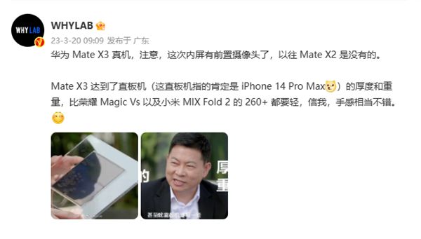 数码博主“WHYLAB”今日透露,华为Mate X3在厚度和重量上甚至比一些直板机(iPhone 14 Pro Max)还要轻一些,也比目前主打轻薄的荣耀Magic Vs以及小米MIX Fold 2都要轻,手感相当不错。