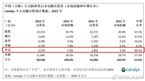 第四名是华硕,销量为377万台,份额为7.8%,同比增长了6.5%。而华为排名第五名,销量为357.6万台,份额为7.5%,同比增长了89.1%。