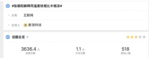 一些数据可以说明,《张朝阳的物理课》的出圈:在微博,#张朝阳解释同温度铁棍比木棍凉#阅读次数3637万,讨论次数超1.1万;在抖音,张朝阳的物理课粉丝152万,播放量超4.3亿。
