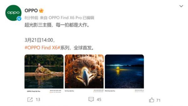 3月17日,OPPO官方微博发帖展示了即将发布的OPPO Find X6 Pro所拍摄的样张。从样张下方水印中的等效焦距来看,这大概分别是OPPO Find X6 Pro使用3X、6X、1X(从左至右)拍摄所得。同时OPPO配文称这次新机上全都为主摄,不分主次。