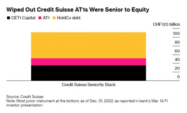 但在这个疯狂的周末,相比于四折贱卖股票的瑞信股东们,有一群人无疑更为“倒霉”——那就是价值约160亿瑞郎(约合172亿美元)的瑞信额外一级资本(AT1)债券的持有者,因为他们才真正向世人演绎了:在本轮欧美银行业风暴中,什么才叫“血本无归”……