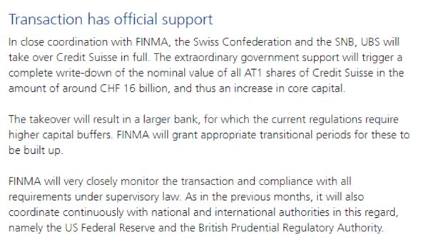 瑞士金融市场监管局(FINMA)当地时间周日在官网上表示:“在瑞士金融监督管理局(FINMA)、瑞士联邦和瑞士央行密切合作下,瑞银将全面收购瑞信。政府的特别支持措施将触发瑞信AT1债券约160亿瑞郎的名义价值被完全减记,从而增强该行的核心资本。”