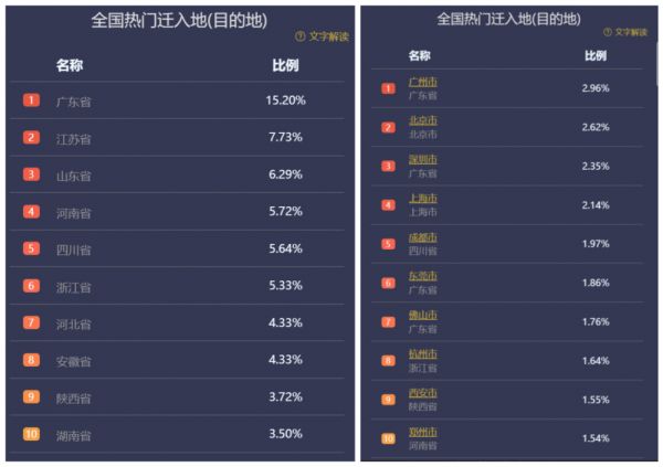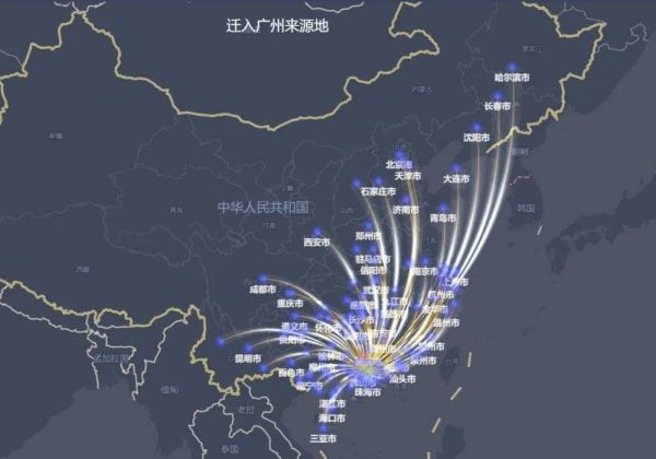 这从最近的人口迁徙地图也可见一斑。在广州、深圳的人口迁入地来源中,除了广东省内之外,最多的是湖南、广西、江西、湖北等省份。