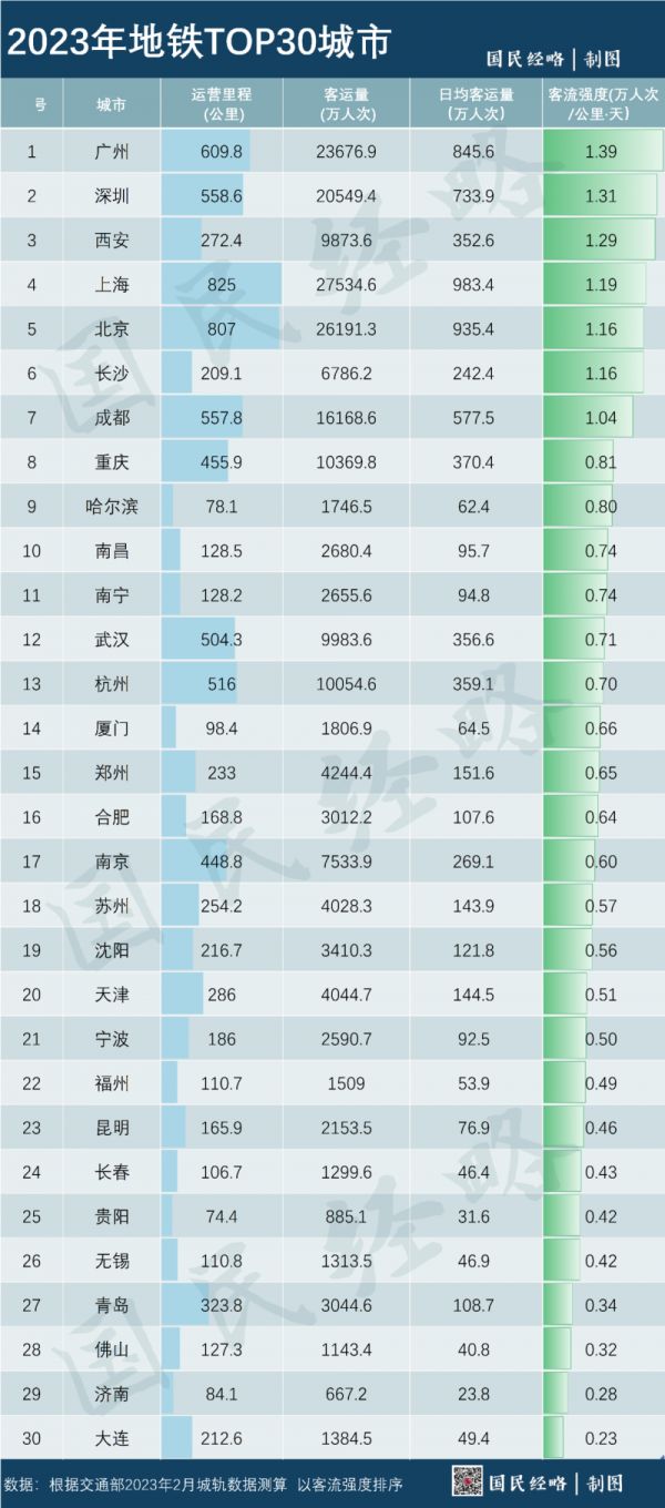 根据《这些城市,正在疯狂建地铁》一文提供的数据,广州、深圳月平均客流强度分别高达1.39、1.31万人次/公里/天,力压京沪,超过了许多二线省会城市的2倍以上。