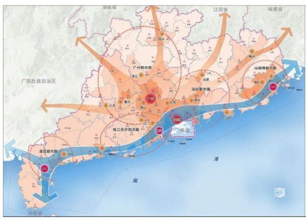 广州都市圈以广州、佛山为中心,辐射肇庆、清远等地,深圳都市圈以深圳、东莞、惠州为中心,辐射汕尾、河源等地。
