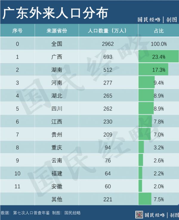 广东的外来人口,主要来自广西、湖南、河南、湖北、四川、江西、贵州等省份,这些地方基本都是人口大省和劳动力输出大省。其中,广东外来人口最多的2个省份是广西、湖南,双双超过500万人。与各自户籍人口规模相比,广西每8个人、湖南每13个人,就有一个来到了广东。