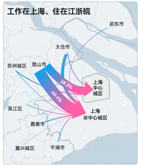 根据长三角跨城通勤报告,上海周边的南通、苏州、嘉兴、无锡等地级市流入上海市域的跨城通勤总人数达到1.48万人,其中苏州的昆山、太仓和苏州城区占了80%左右。