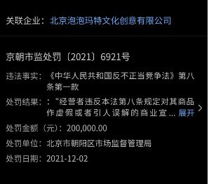 但是,泡泡玛特的黑历史可真不少。2021年12月,泡泡玛特因为作虚假或引人误解的商业宣传,或者通过组织虚假交易等方式,帮助其他经营者进行虚假或者引人误解的商业宣传,被责令停止违法行为,还遭到北京市朝阳区市场监督管理局20万元的罚款。