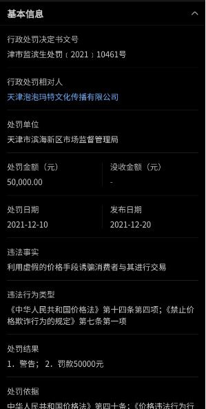 2021年12月,天津泡泡玛特文化传播有限公司因为利用虚假的价格手段诱骗消费者与其进行交易,被天津市滨海新区市场监督管理局警告,并处罚5万元。