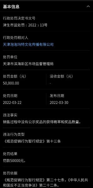 等到2022年2月,由于销售过程中没有公示奖品的获得概率和奖品数量,天津泡泡玛特文化传播有限公司被天津市滨海新区市场监督管理局处罚5万元。