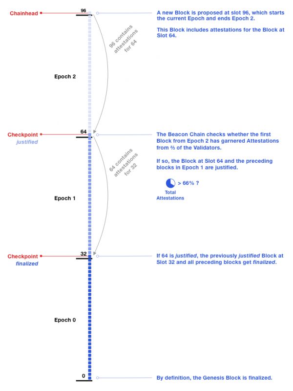 如果检查点B被证明是合理的,并且紧接的下一个周期中的检查点被证明是justified的,那么B将被最终确定为Finality。通常,一个检查点会在两个时期内完成,即12.8分钟。