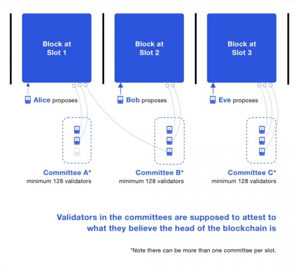 委员会是一组验证者。委员会的选取、提议者的设立、验证者的安排都是在称为RANDAO的伪随机过程中实现的。每个时隙有一个提议者和至少128个验证者组成的委员会。一个验证者每个周期只能在一个委员会中。通常,网络中有超过8192个验证者,从而保证每个时隙有两组委员会。