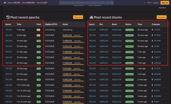 在信标链的区块链浏览器(https://beaconcha.in/)中,我们可以验证上述共识机制是否如上所述运行,并且进一步加深我们的理解。