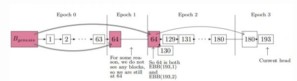 注意Slot65到Slot128没有区块。Epoch2检查点应该是Slot128上的区块。由于缺少区块,Epoch2检查点是仍然是Slot64上的区块。Epoch 3的情况类似,Slot192是空的,因此前一个块Slot180是Epcoh3检查点。
