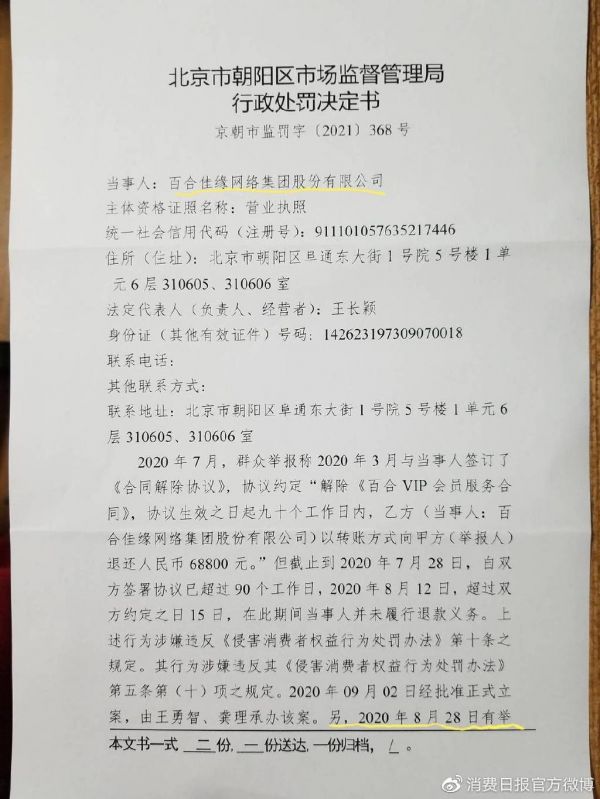 2020年8月28日,北京市朝阳区市场监督管理局对百合佳缘网络集团股份有限公司侵害刘嘉消费者合法权益一事进行立案调查,调查显示,百合佳缘在服务合同中写到“在红娘服务期间根据甲方个人档案制定征婚方案,对择偶要求进行精准定位”,但百合佳缘只能提供《会员交接表》,称此即为征婚方案,其内容与一般定义的方案存在较大差异,最终北京市朝阳区市场监督管理局认定百合佳缘在对刘嘉提供服务时存在“骗取消费者价款或者费用而不提供或者不按照约定提供商品或服务”的行为。2021年4月29日,北京市朝阳区市场监督管理局对百合佳缘作出32万元的行政处罚决定。
