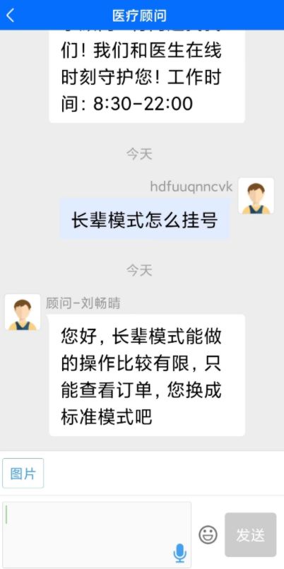 点击“电话问诊”,用户就进入与医疗顾问聊天模式。当问及“长辈模式怎么挂号”时,医疗顾问却回复称,“长辈模式能做的操作比较有限,只能查看订单,您换成标准模式吧。”