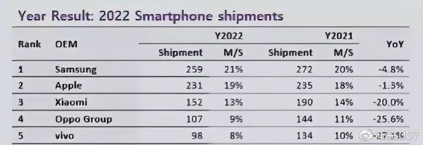 根据分析机构给出的2022年全球手机市场的数据,数据显示三星在2022年的出货量仍然高达2.59亿部,同比下滑幅度只有4.8%,低于全球手机市场9.9%的衰退幅度,这样的数据无疑显示出三星已经稳住了阵脚。