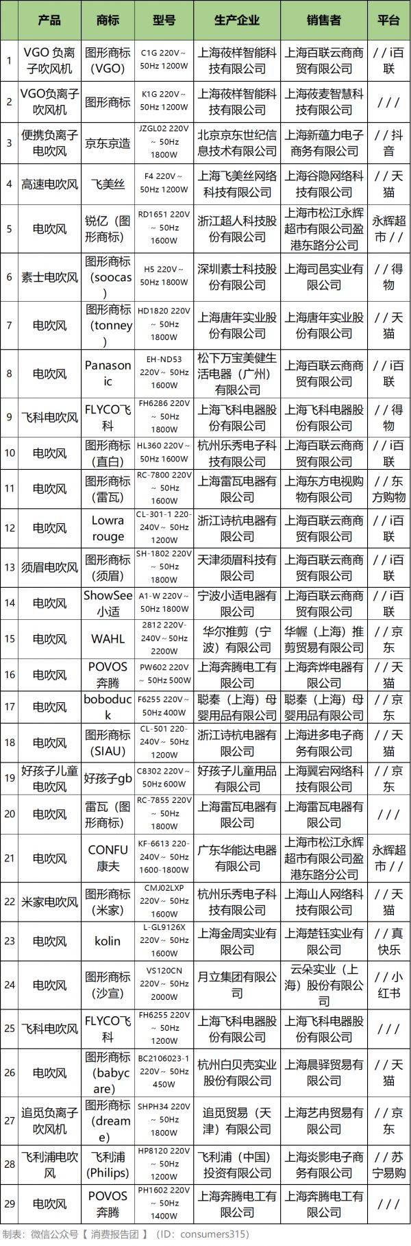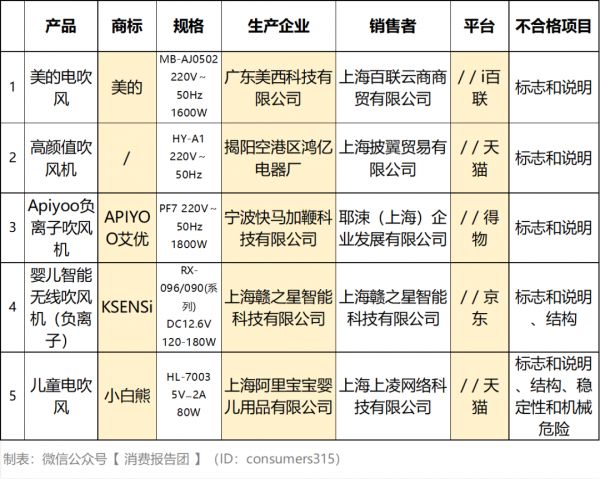 广东美西科技有限公司生产的MB-AJ0502美的电吹风、宁波快马加鞭科技有限公司“艾优”PF7负离子吹风机等,分别检出“标志和说明”项目不合格。