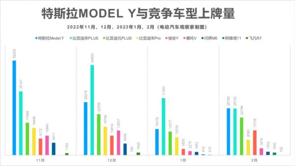 通过1月份4万元左右的降幅,Model Y从2月份开始回到“月销3万”的趋势当中,并对竞争对手产生了连锁反应: