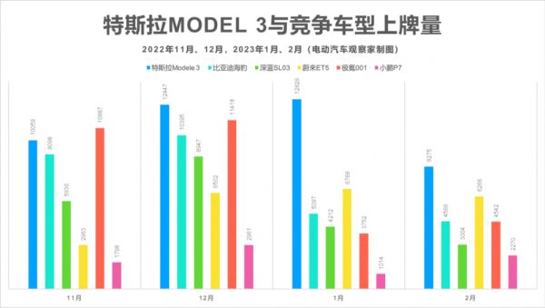 倒是作为Model 3“平替”的深蓝SL03在Model 3入门款与其顶配价格几乎重叠后,受影响严重,在1月中止了月销过万的上升势头,并在2月迎来了较大的跌幅。