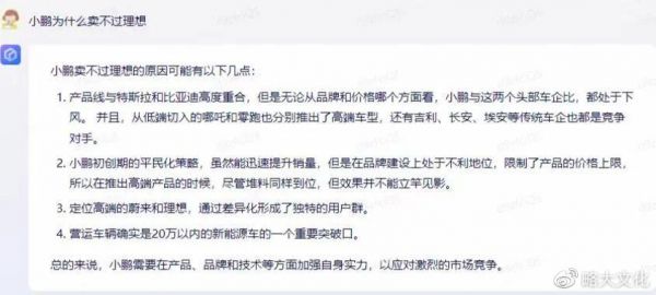 邀请测试会后,“略大参考”也第一时间体验了文心一言,一部分答案超出预期,大部分答案都能给出系统性的分析,部分观点还很新颖。至少在中文层面,产品的完成度比较高。比如针对”小鹏为什么卖不过理想“这一问题,文心一言从品牌、产品、市场、价位等多方面对两家车企进行了分析,也提到了差异化、堆料、高端化这些当下市场的热点问题。