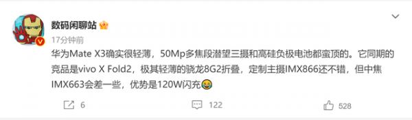 据一些数码博主透露,华为Mate X3在厚度和重量上甚至比一些直板机(iPhone 14 Pro Max)还要轻一些,也比目前主打轻薄的荣耀Magic Vs以及小米MIX Fold 2都要轻,手感相当不错。