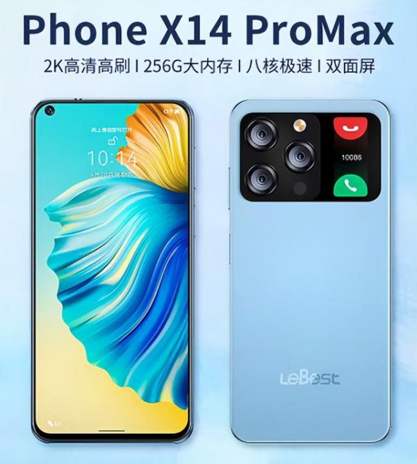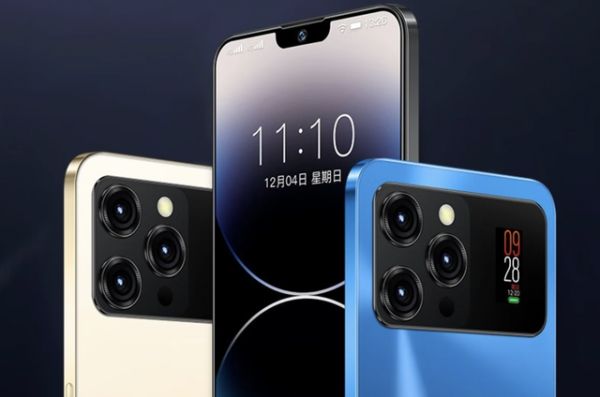 最骚的还是这台机器的外观设计,是苹果、小米看了都要沉默的地步。它的整体设计和iPhone非常类似,像是立体的直角边框、小刘海等等,甚至连iPhone 14 Pro的壁纸都直接给偷过去了。