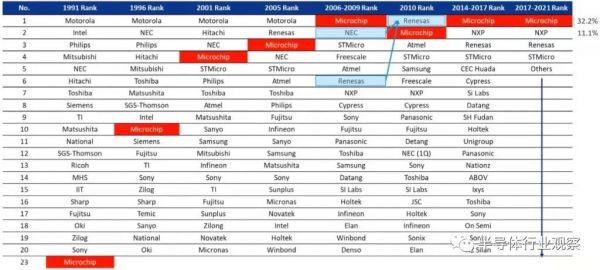 Gartner 2021 年市场份额报告中的全球 8 位微控制器市场份额(图片来源:Microchip)对于TI来说,情况则稍有不同。从上图可以看到,自2005年以来,TI在八位市场就进不了全球TOP榜单。