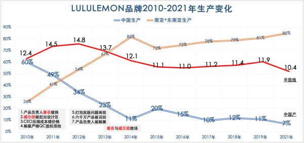 原因一:中国生产大幅下降——CEO克莉丝汀将中国供应商订单从60%砍到11%,转到“质量你懂”的越南和柬埔寨等国生产。lululemon平效变化,与一年后的中国产量变化同步。