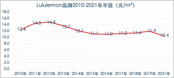 服饰品牌平效最高的是lululemon,近20年都在10万元以上(1500-2000美元/平方英尺),世界品牌零售中排第3,仅次于苹果和蒂芙尼。