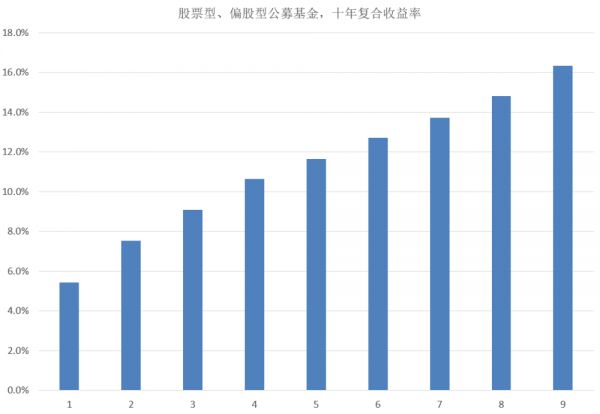 近十年全体股票型和偏股型公募基金的分10档收益分布见下图。相比之下,公募基金的业绩还是要比上市公司强一些。所以说,金融行业确实比实体经济更容易赚钱。