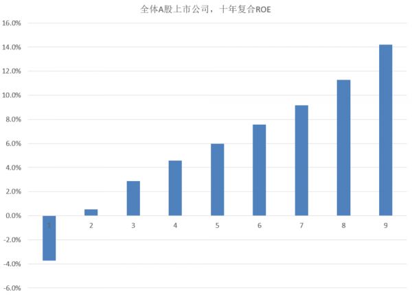 在股言股,我们先来看看A股上市公司的净资产收益率。以最近十年财报为样本,全体A股的净资产收益率(ROE)可以分为10档,分布如下: