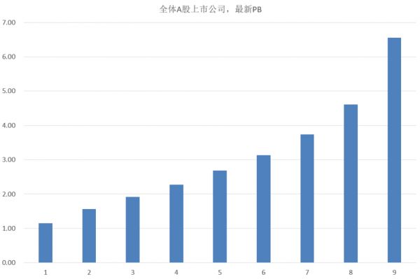 全体A股上市公司的PB中位数是2.7。也就是说,为了把手上的钱变成上市公司的一部分,中位投资者需要支付170%的溢价。另外,A股公司中PB最高的10%是6.6倍,最低的10%也有1.2倍,极少有公司是折价的。