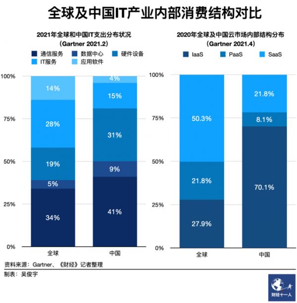 中国IT支出结构中,软件的占比也长期低于世界平均水平。研究机构Gartner 2022年数据显示,2021年全球IT支出结构是,硬件占比19%、服务占比28%、软件占比14%。当年中国IT支出结构是,硬件占31%、服务占15%、软件占4%。硬件支出远大于软件,被认为是中国企业软件市场长不大的重要因素。