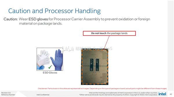 Intel还特别提醒,安装新处理器的时候,必须佩戴防静电手套,而且不能触摸疯转边缘,以免氧化或者异物入侵。