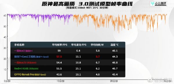 从性能跑分来看,骁龙7+ Gen2的表现已经超预期了,那么游戏及功耗方面如何呢?根据原神数据显示,骁龙7+ Gen2工程机平均帧率57.5帧、平均功耗5.7W,机身温度44.3℃。作为对比,搭载天玑9000的一加Ace2V全面落败,无论是平均帧率、功耗和温度,都不及骁龙7+ Gen2的工程机。