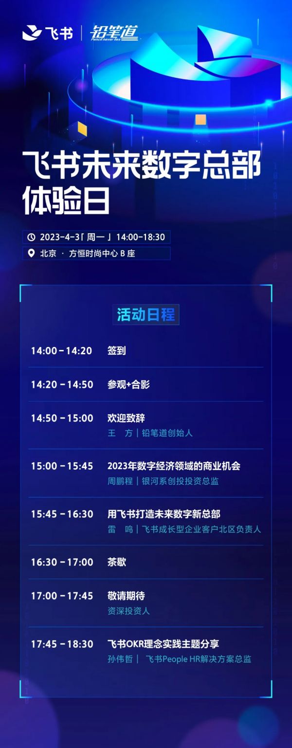 我们的学习形式多样:由铅笔道担任领队,带领创业家参观留影了解飞书,再由飞书成长型企业客户北区负责人为大家分享主题:怎样打造企业数字新总部。同时,我们还将带领投资人嘉宾一同前往,分享数字经济的最新创业机会。